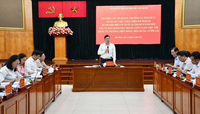 Đồng chí Hoàng Nguyên Dinh phát biểu kết luận buổi làm việc. (Ảnh: SGGP)Chiều 22/10, Tổ công tác số 10 của Ban Thường vụ Thành ủy TPHCM do đồng chí Hoàng Nguyên Dinh, Ủy viên Ban Thường vụ Thành ủy, Phó Trưởng Ban Tuyên giáo và Dân vận Thành ủy TPHCM, làm Tổ trưởng giám sát thực hiện kế hoạch số 249-KH/UBKTTW ngày 24/7/2025, của Ủy Ban Kiểm tra Trung ương tại Đảng ủy phường Diên Hồng, Hòa Hưng và Vườn Lài.